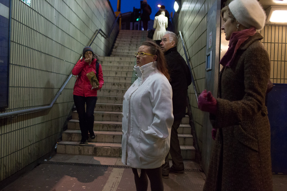 People coming out of a tunnel (some of you will recognise the Old Street tube station), at a mini crossroads. A woman stuffing her face with fast food with her eyes closed, a man nervously looking back, and two women in the center. The one in white, hands in pockets, not fully comprehending her next move yet, but it’s the other one that makes the shot for me. It’s her pointing straight at the lens, but looking away from it that makes it all come together. Me pointing the massive lens at here, she pointing at her image being captured – a mini mental loop in a split second. The out of focus hand somehow adds to the whole scene.